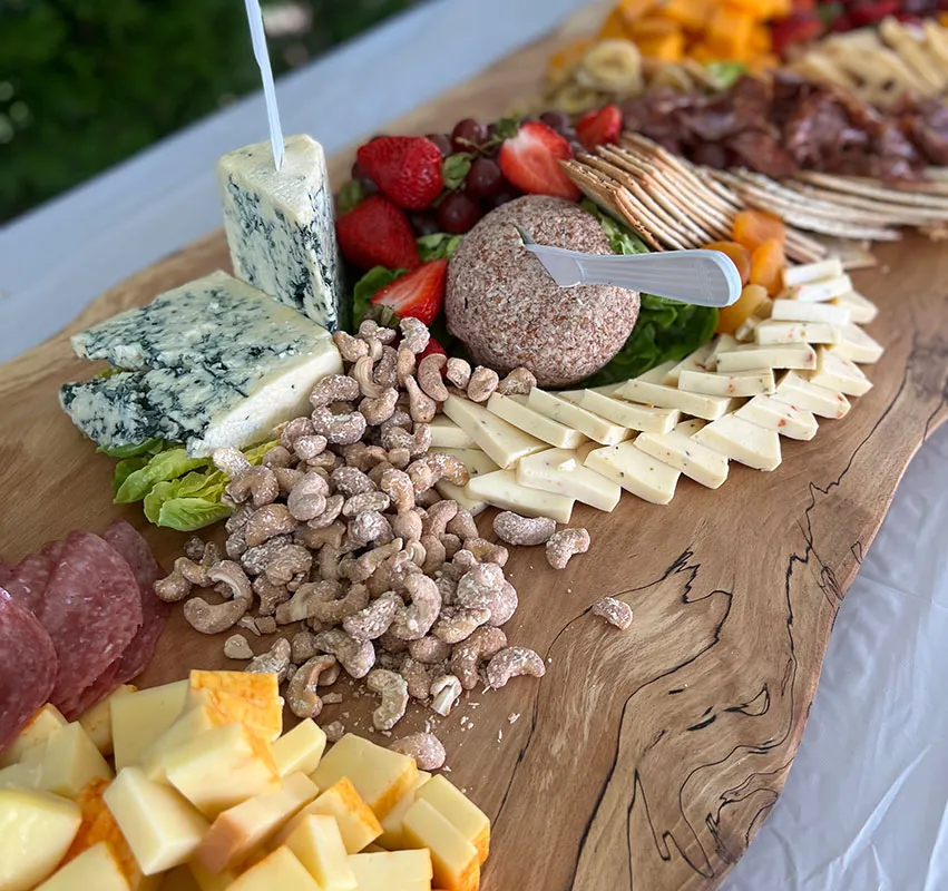 We’re pleased to offer incredibly fresh and delicious food every day, but we understand that special occasions call for something unique. That’s why we partnered with local craftsman John Mikuzis to create hardwood boards up to eight feet long for our expansive charcuterie displays. Our Grazing Tables are nothing short of stunning, filled with a delicious array of fresh and dried fruit, gourmet cheeses (including our blue cheese ball), artisanal crackers & breads, cured meats, house-made dips, and other delights.